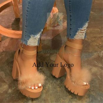 Nueva moda bloque tacón esponjoso decoración punta abierta zapatos de mujer correa de tobillo hebilla plataforma señora sandalias peludas
